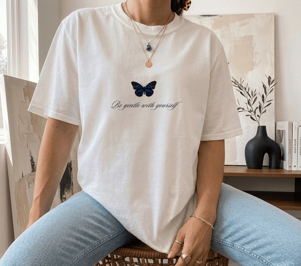 Elevate your streetwear with the Be Kind Oversized T-Shirt. Crafted from 240 GSM heavyweight cotton with a boxy, relaxed fit, it features a realistic Blue Morpho butterfly and the elegant phrase “Be gentle with yourself”.