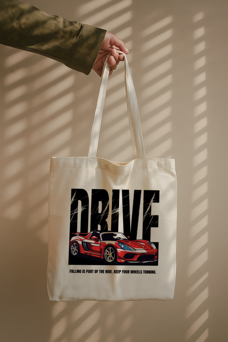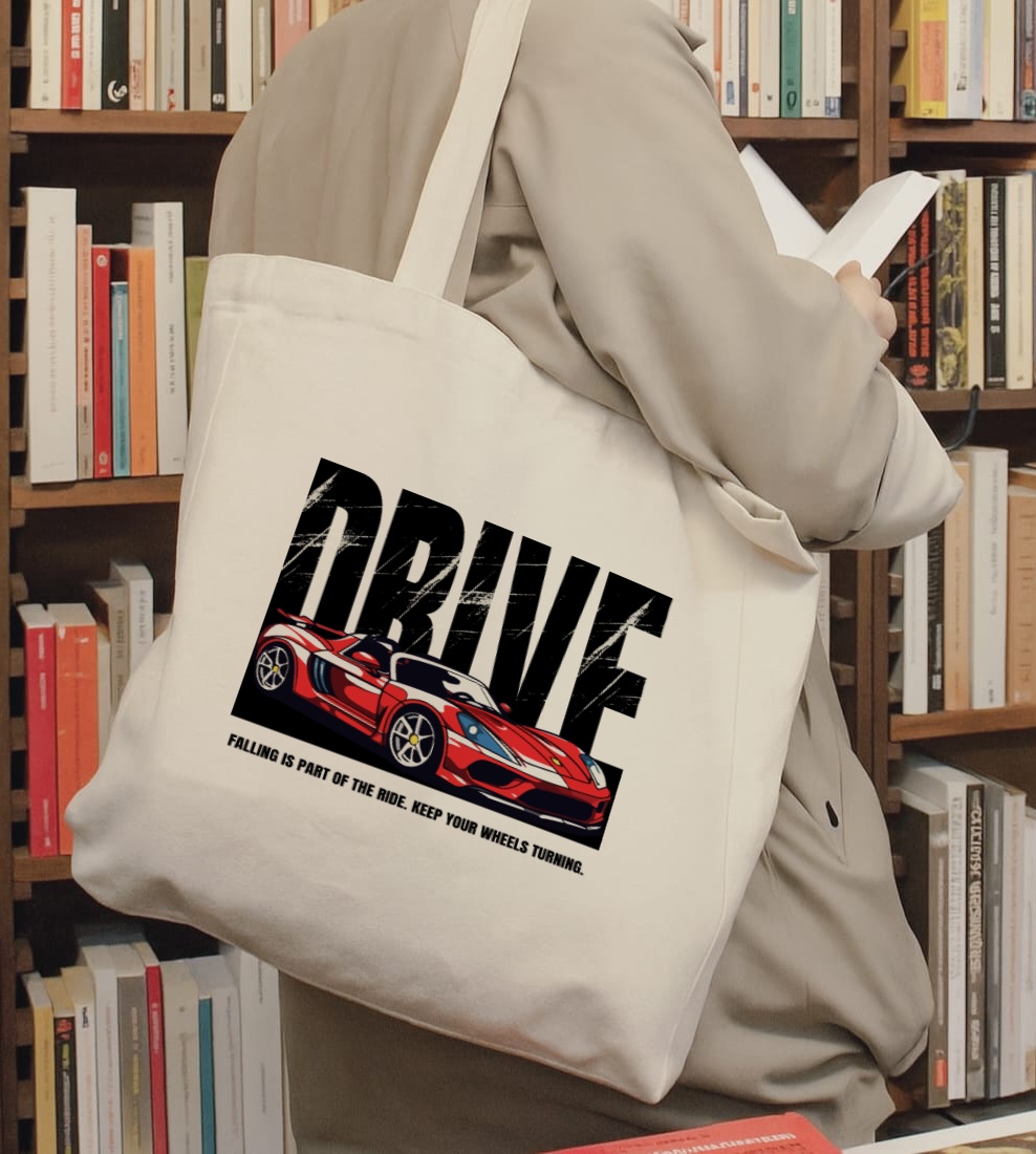 Keep rolling forward with the Falling Is Part of the Ride Tote Bag — a sleek design featuring a sporty car illustration and the quote “Falling is part of the ride. Keep your wheels turning.”