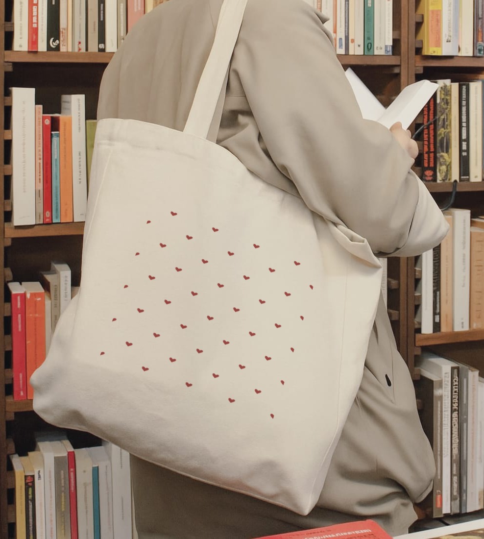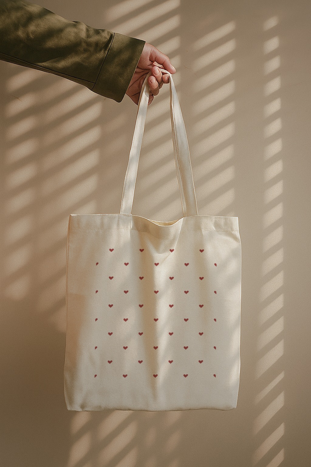 A charming tote covered in dainty maroon hearts — simple, sweet, and perfect for everyday use with a touch of love and warmth.