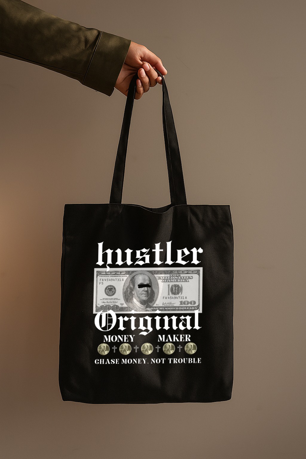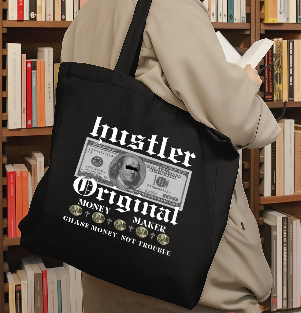 Step into your grind era with the Hustler Original Tote Bag — a statement piece for those who believe in ambition and hustle. Featuring a creative dollar-inspired artwork with witty detailing, this tote captures the energy of street style and self-made confidence.