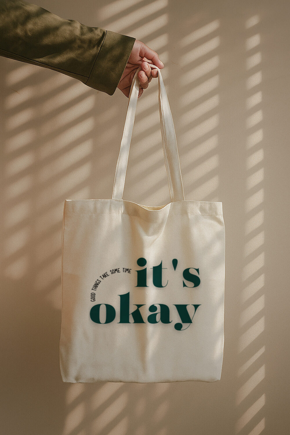Featuring the comforting phrase “It’s okay” in bold, rounded typography and the gentle words “Good things take some time” curved above, this design captures quiet reassurance and mindful living.