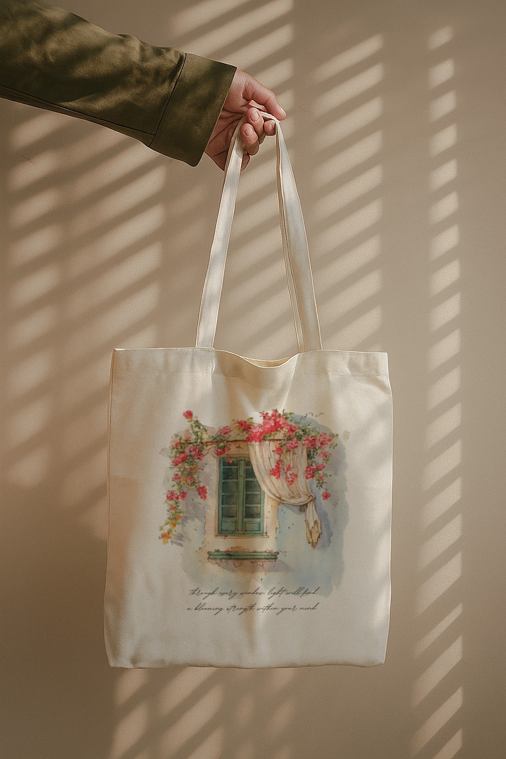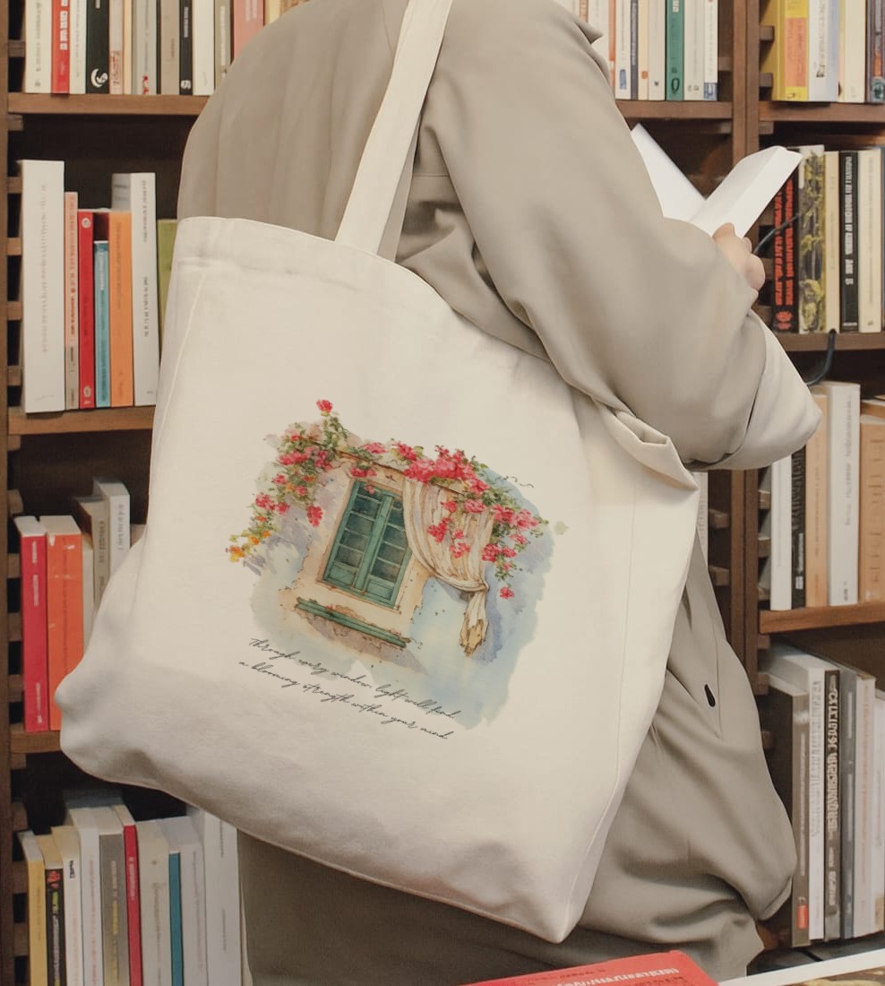 A dreamy tote featuring a watercolor-style window surrounded by blooming flowers — soft, colorful, and full of romantic charm.