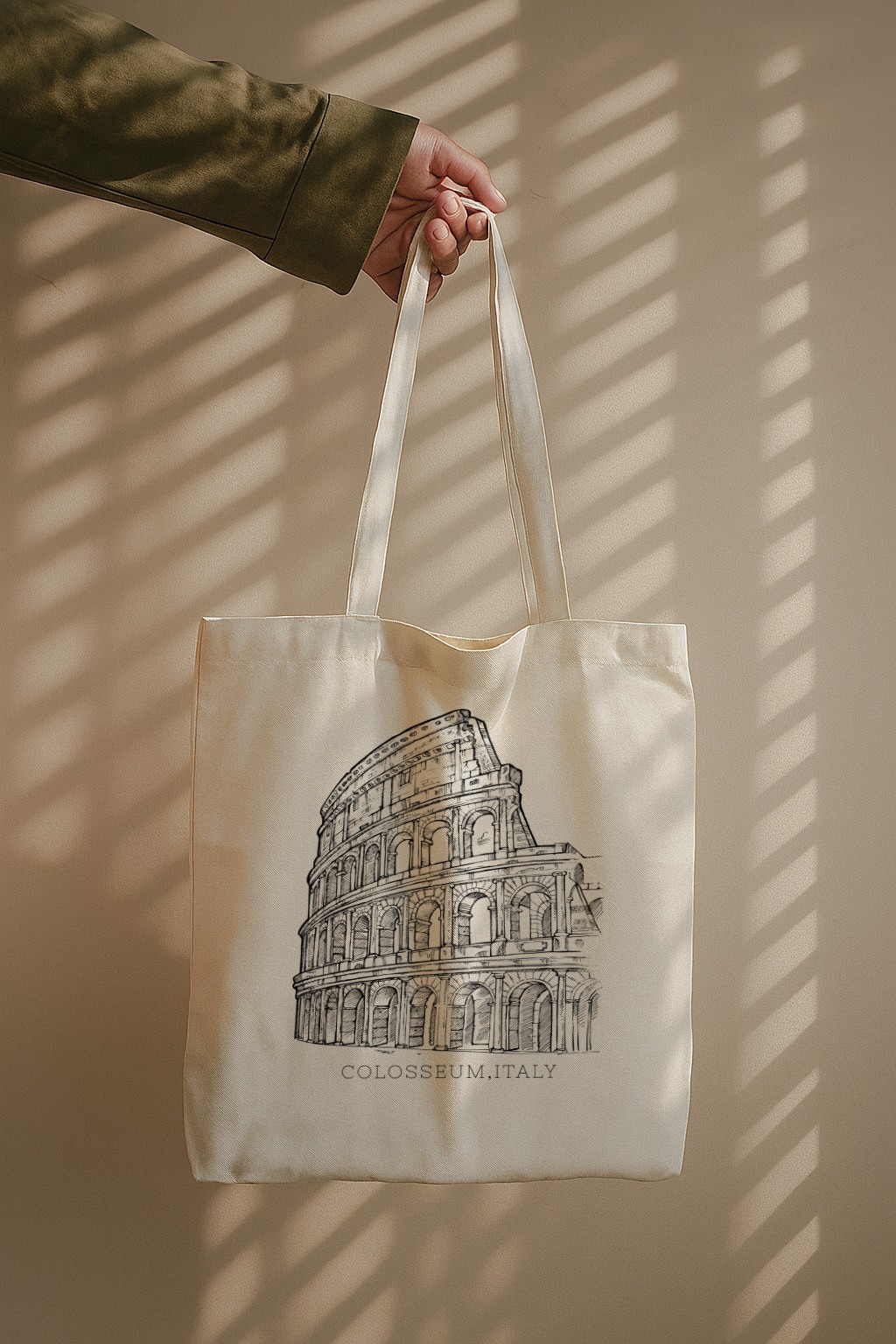The illustration showcases the Colosseum, one of Italy’s most iconic landmarks, drawn in a delicate pen-style sketch. Each arch and curve reflects the monument’s ancient grandeur, giving the tote an elegant, cultured feel.