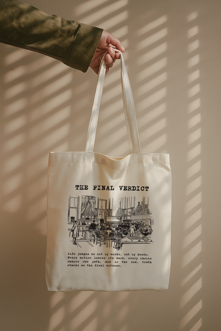 Step into the courtroom of conscience with “The Final Verdict” tote bag — a monochrome masterpiece that symbolizes balance, truth, and inner judgment. The striking black-and-white court illustration makes a statement without words, while the minimal design brings sophistication to your everyday carry.
