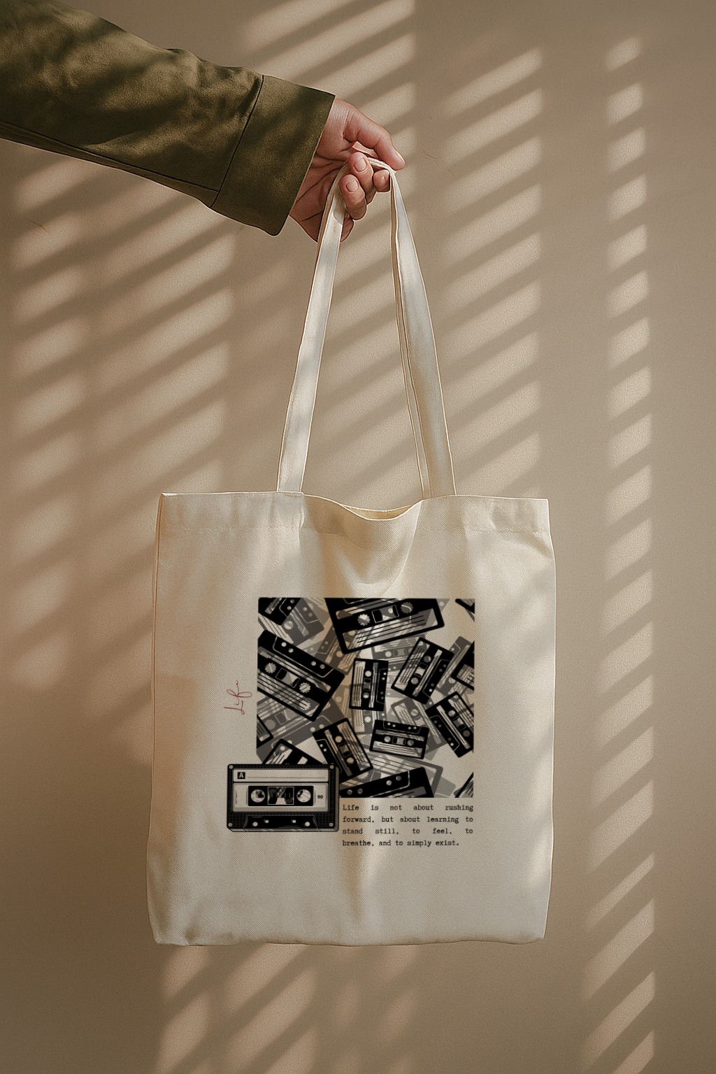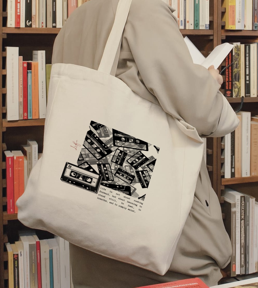 A nostalgic tote blending vintage cassette art with a mindful quote — a tribute to music, memory, and the beauty of slowing down.
