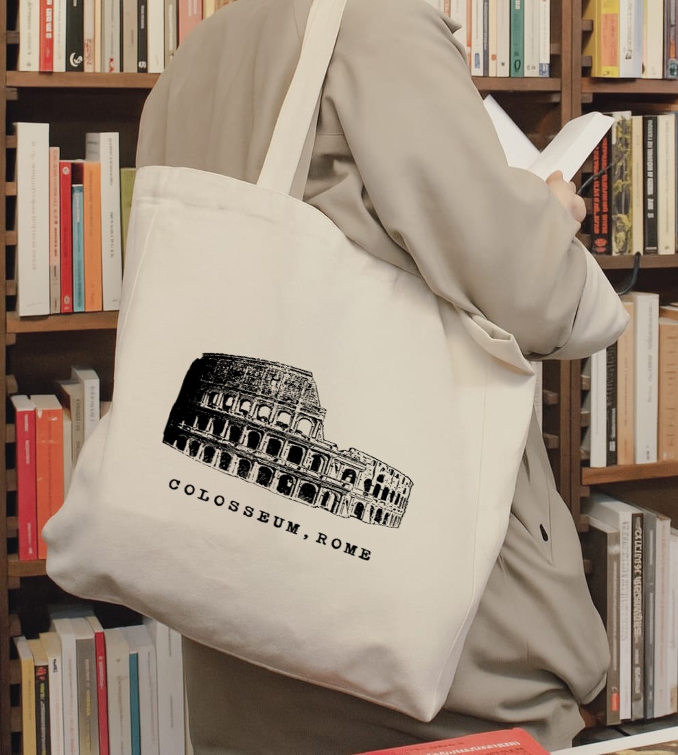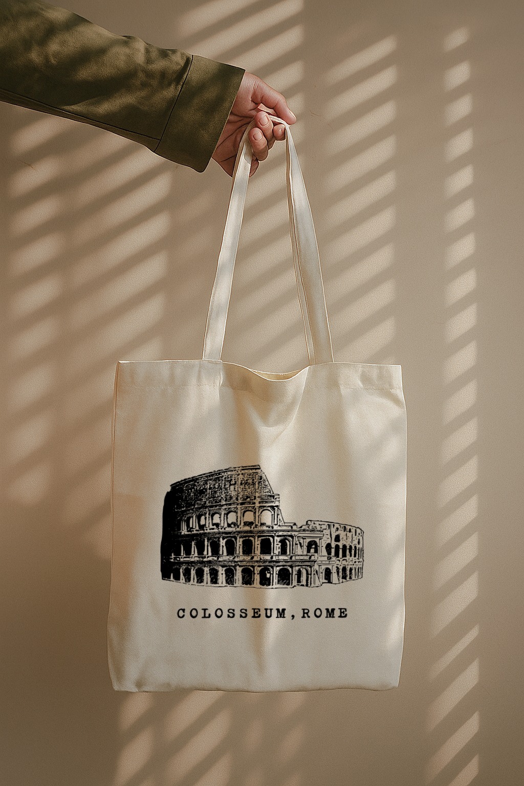 A bold, monochrome tote featuring a dramatic Colosseum illustration — a timeless tribute to Rome’s grandeur and architectural beauty.