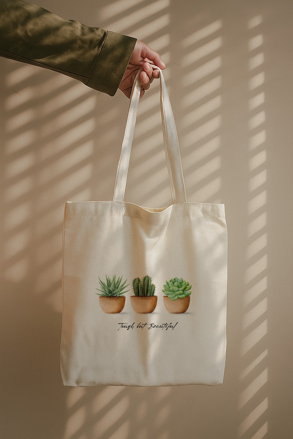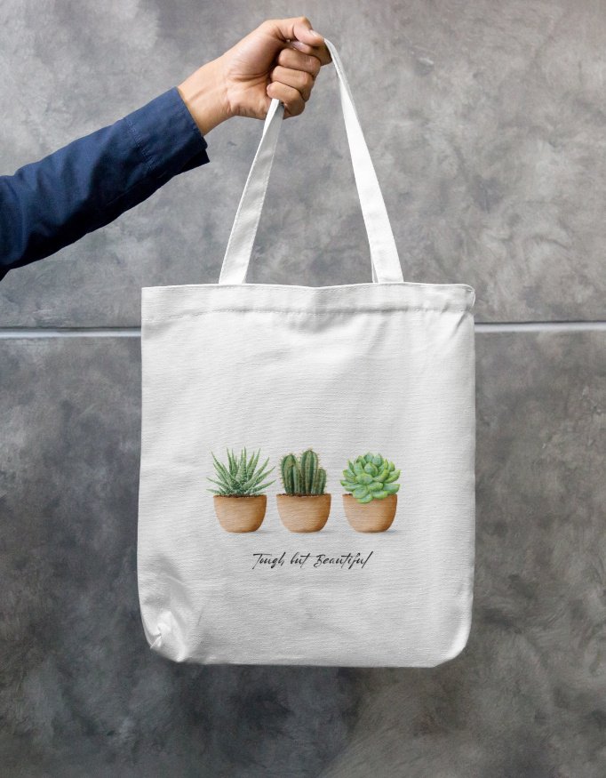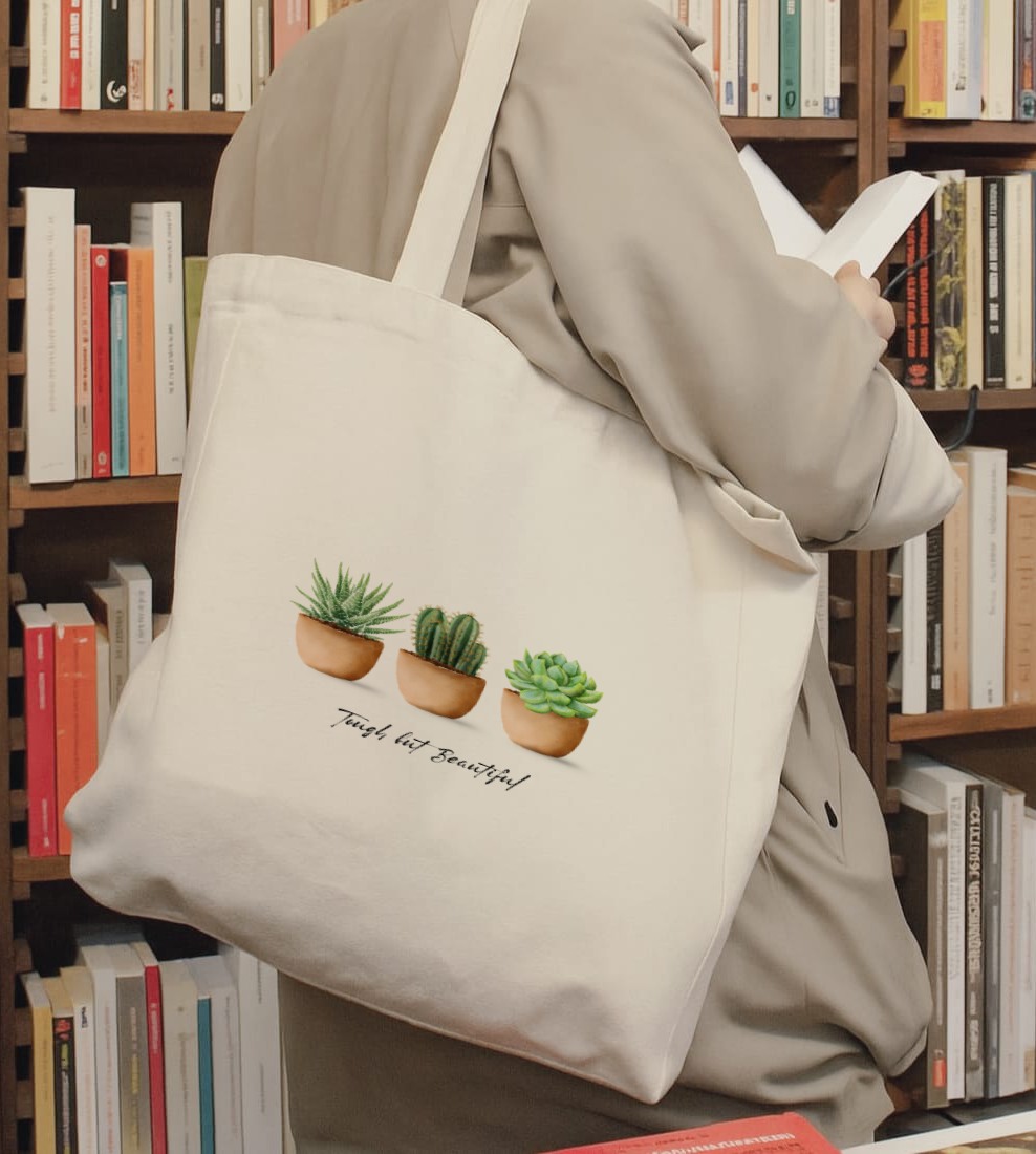 The Tough But Beautiful Tote Bag celebrates nature’s quiet strength through a trio of charming succulents — each thriving in its own way.