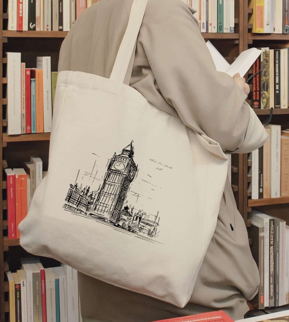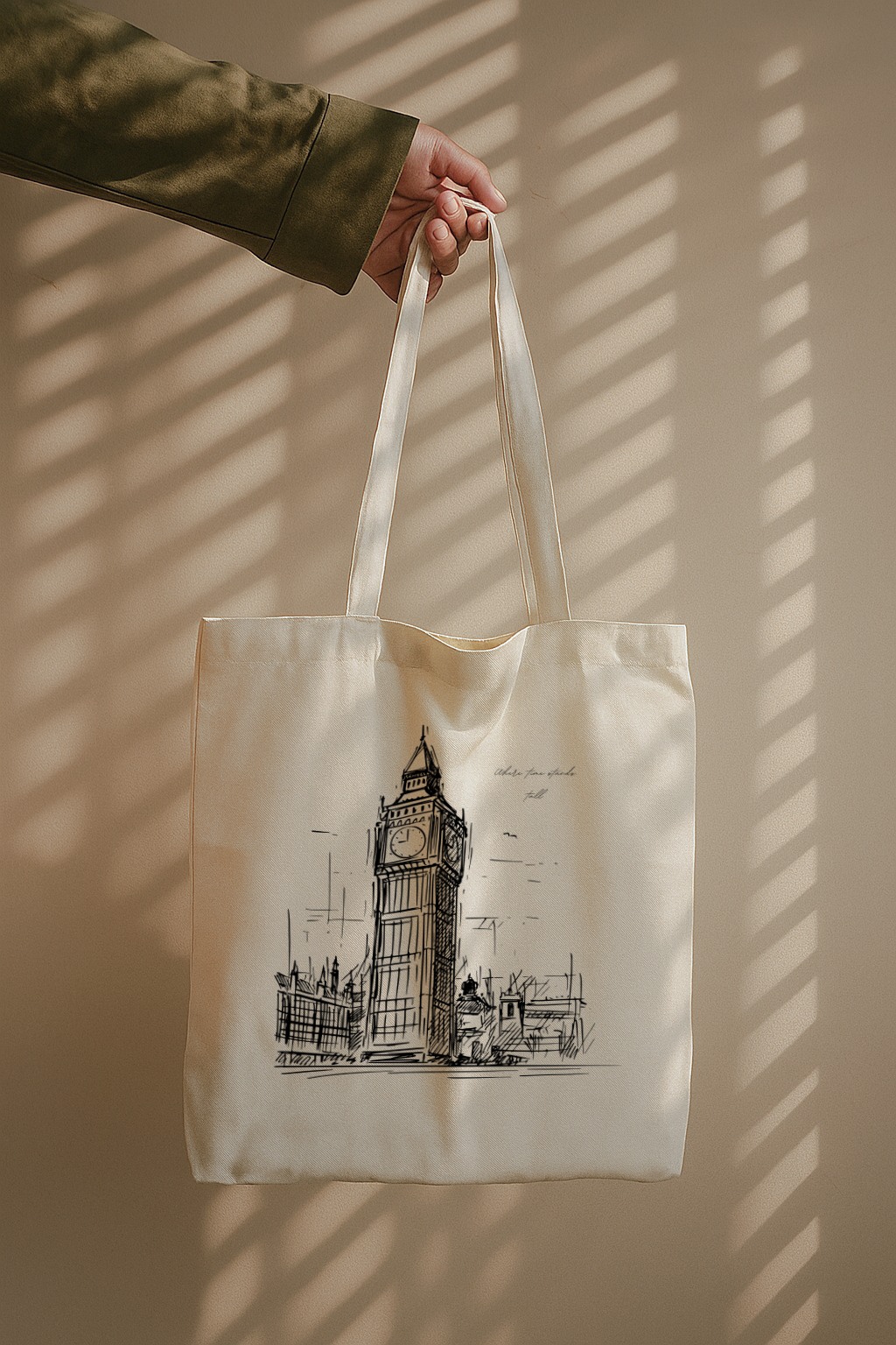 An elegant tote featuring a hand-drawn sketch of London’s iconic Big Ben with the poetic phrase “where time stands tall” — timeless, artistic, and travel-inspired.