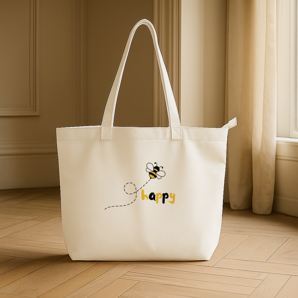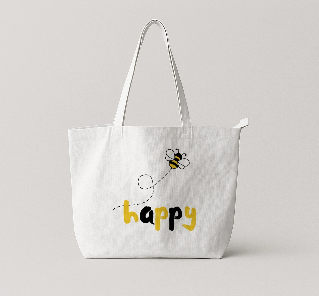 Bright white canvas tote with a cheerful bee illustration and the word โ€œhappy.โ€ Uplifting, spacious, and perfect for everyday positivity. ๐Ÿ