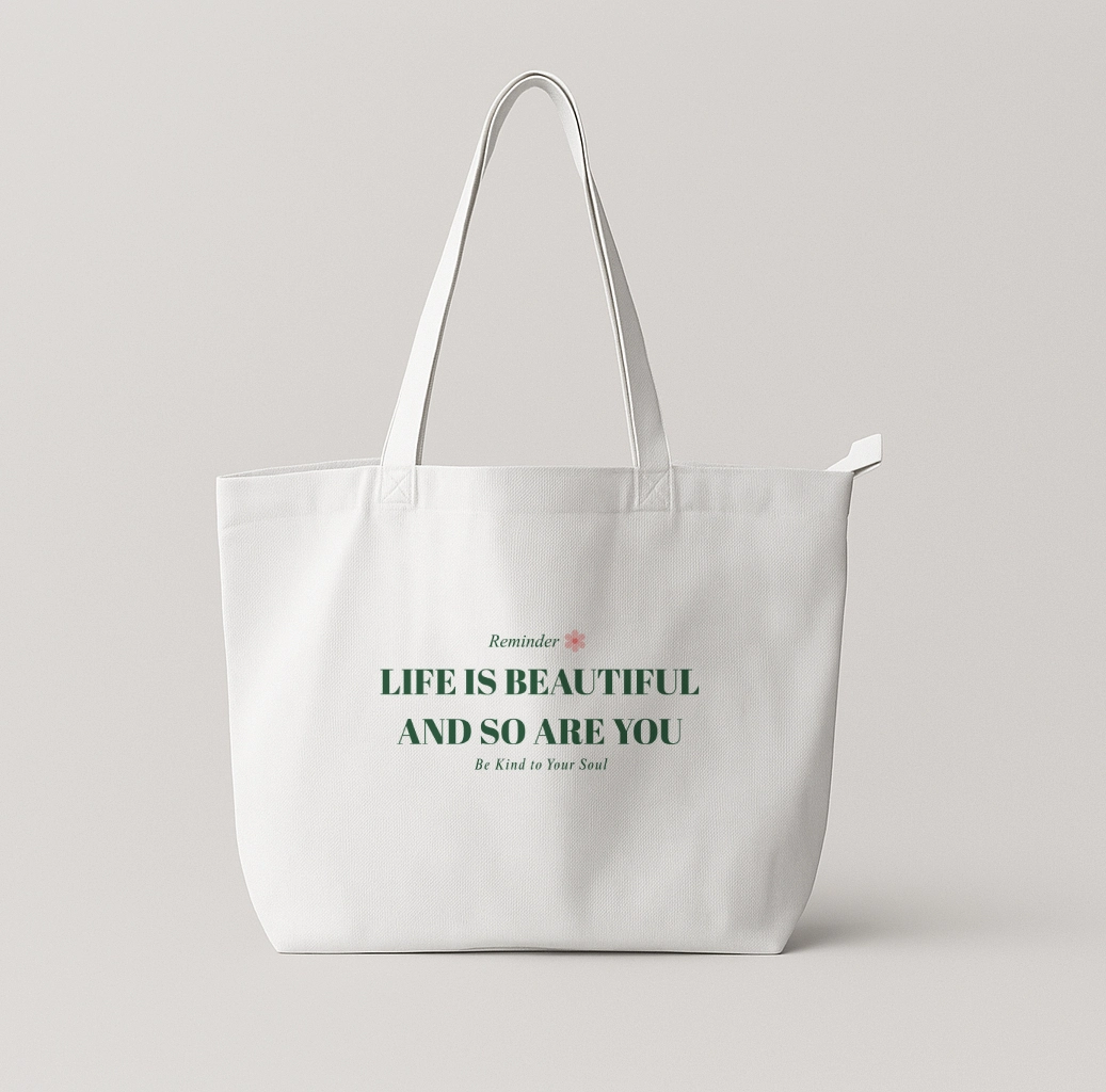 A minimalist white tote with the uplifting message βLife Is Beautiful and So Are You.β Calm, elegant, and perfect for everyday inspiration.