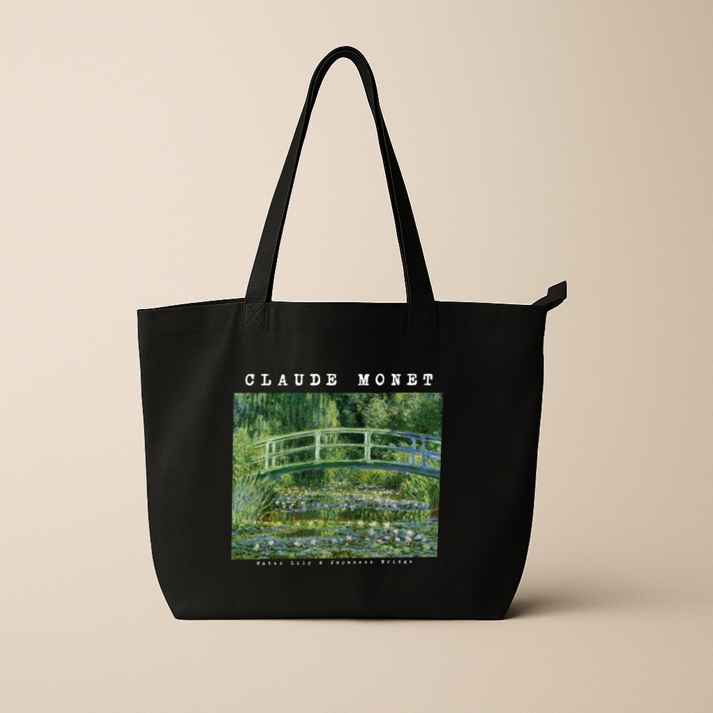 Elegant black tote featuring Claude Monet’s iconic Water Lily & Japanese Bridge painting. Perfect for art lovers and sophisticated style.