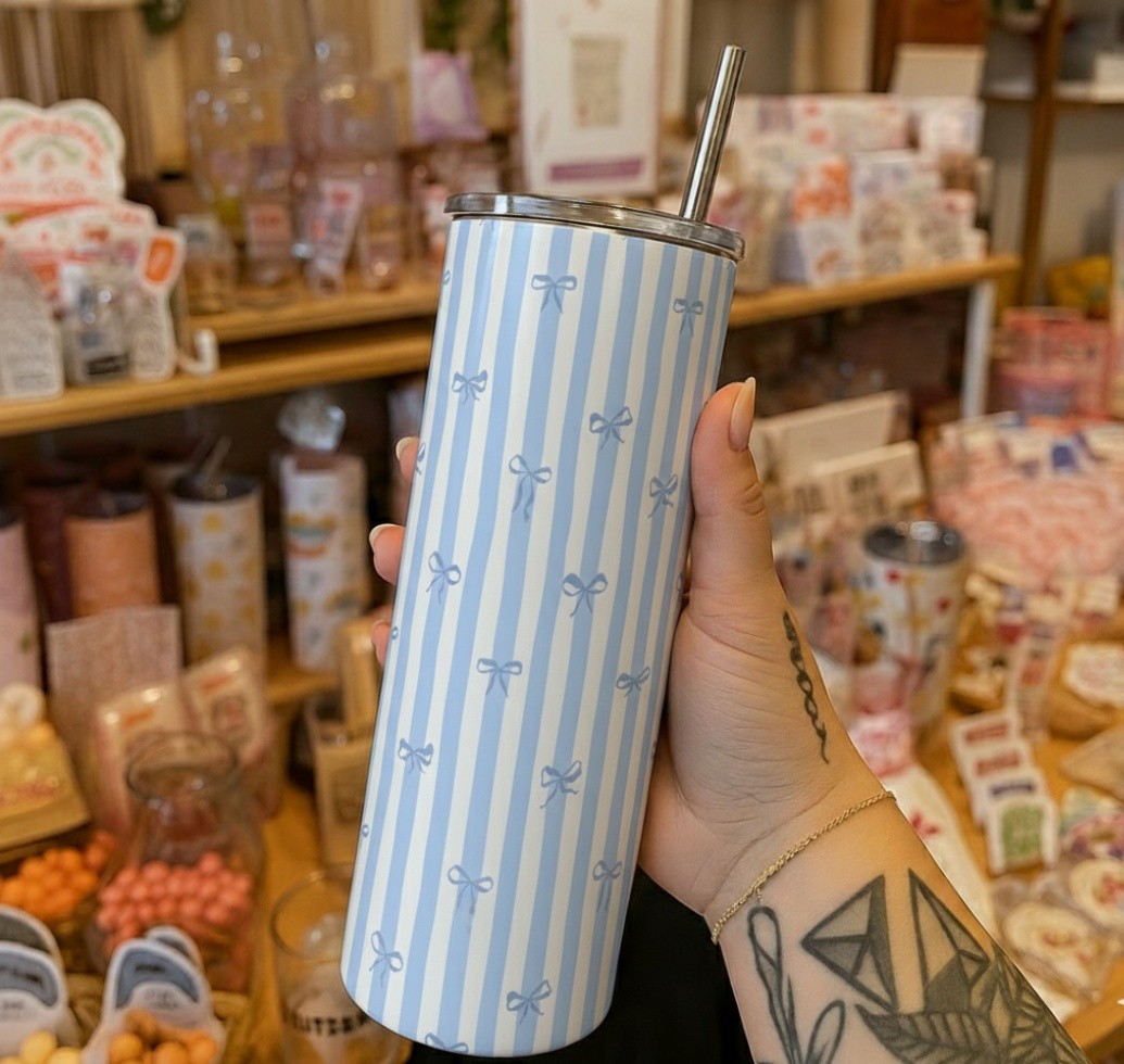 A 20 oz white and baby blue stainless steel tumbler featuring delicate bows over vertical stripes. Insulated, spill-proof, and perfect for preppy and cute aesthetics.