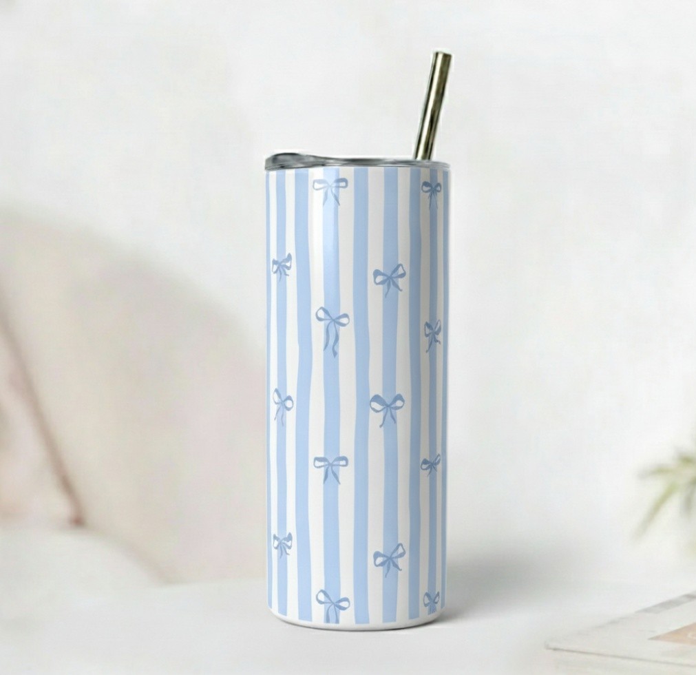 Elevate your daily hydration with the Blue Stripe & Bow Tumbler, a 20 oz stainless steel tumbler featuring a delicate, classic pattern. Vertical stripes in crisp white and soft baby blue form the backdrop for small, sporadically placed bows in matching blue, creating a charming, preppy aesthetic. This design feels fresh, feminine, and slightly nauticalβ€”perfect for anyone who loves refined, minimal, and cute drinkware.