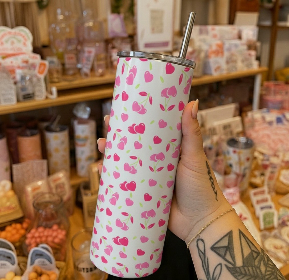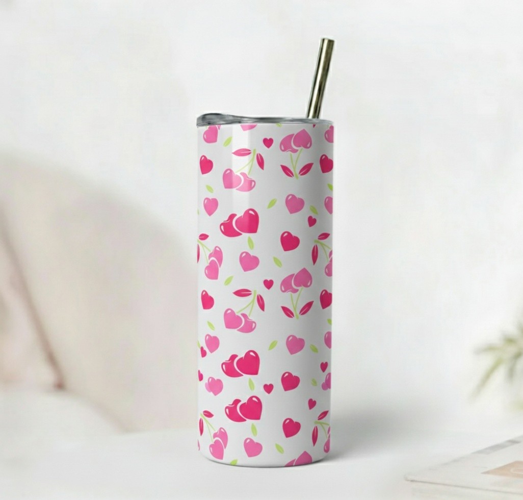 A cute 20 oz stainless steel tumbler with a pink cherry and heart pattern. Double-wall insulated, lightweight, and perfect for everyday use.