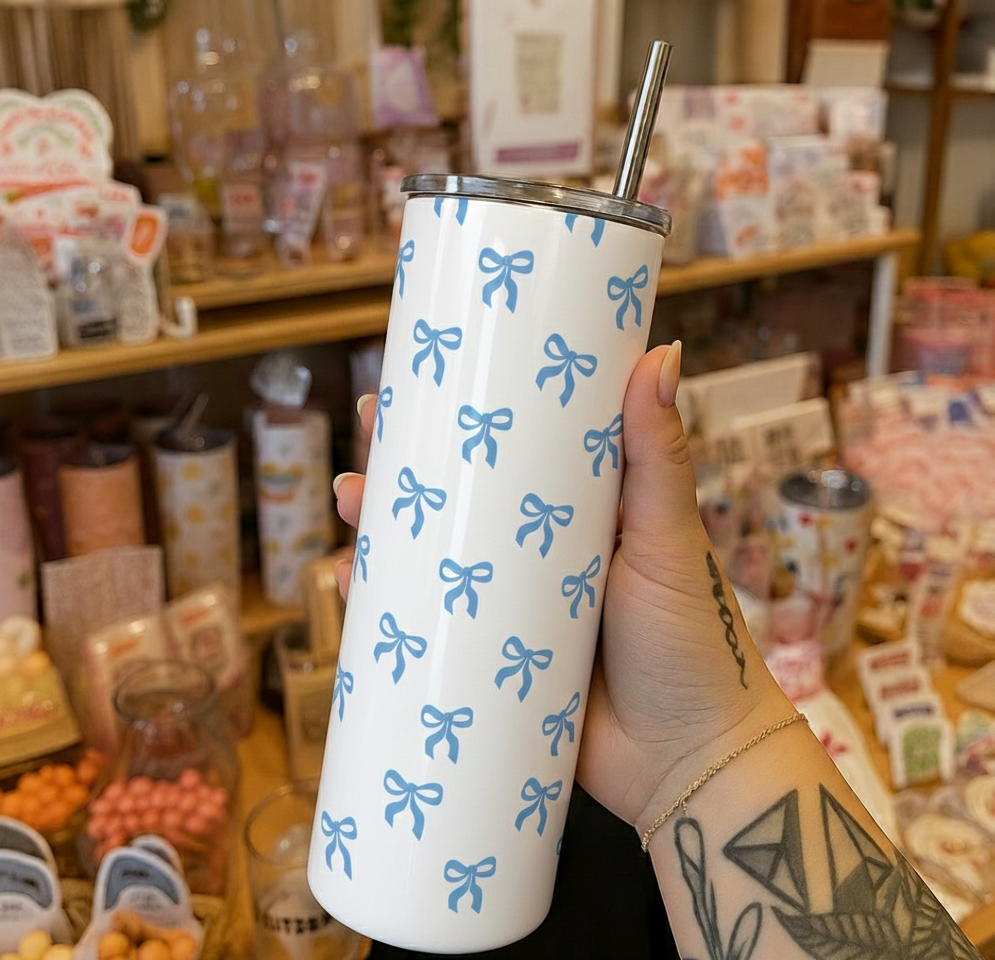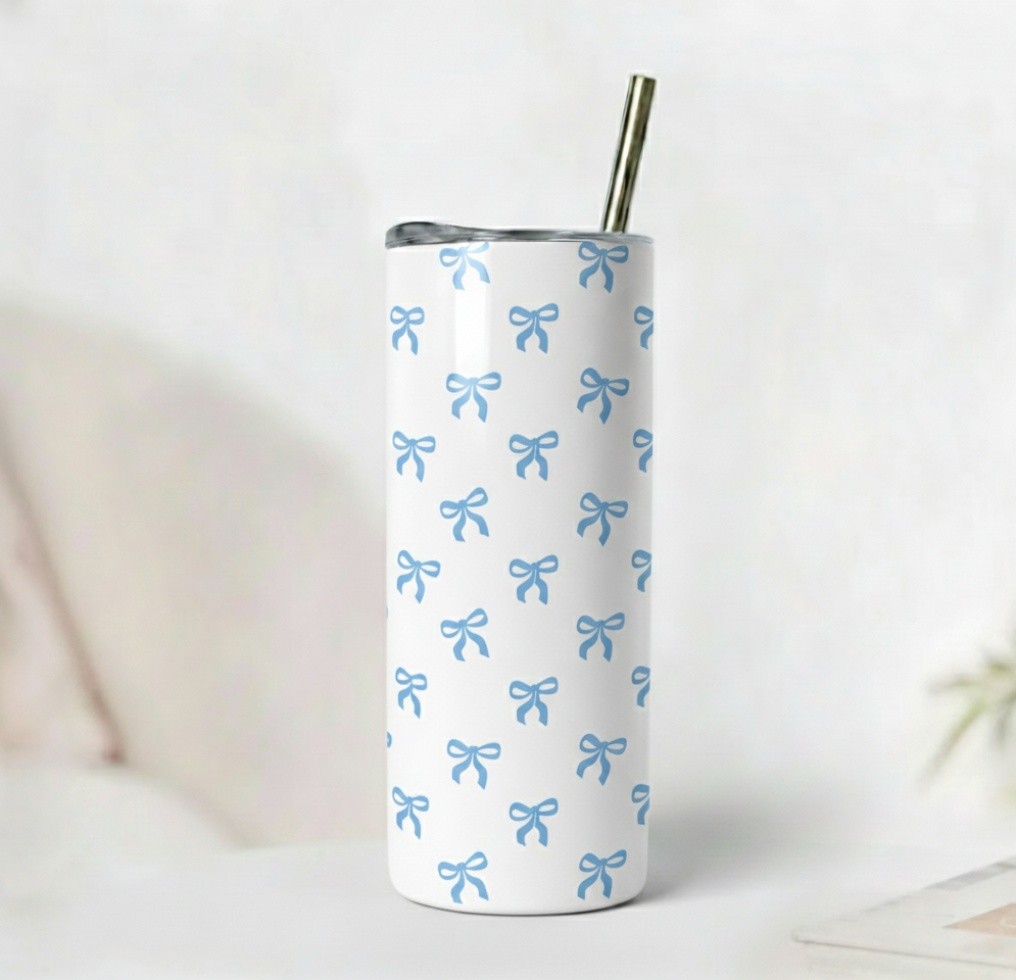 Whether you’re enjoying iced coffee, tea, smoothies, or water, the Classic Blue Bow Skinny Tumbler adds a gentle, elegant charm to every sip.