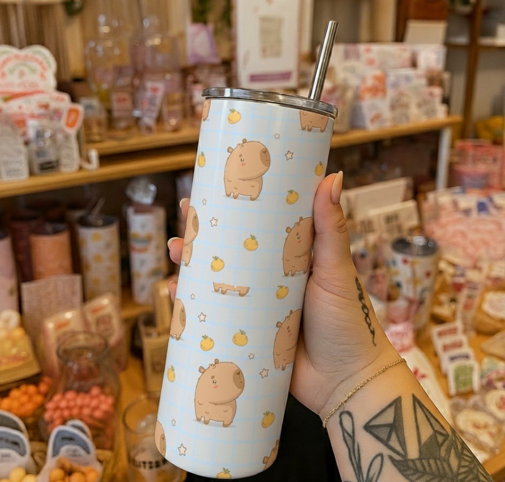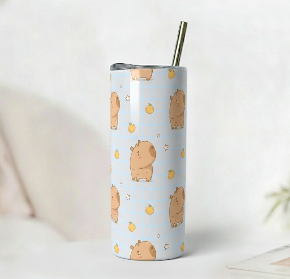 A soft pastel tumbler featuring adorable capybaras on a blue gingham background with tiny fruits and stars. Insulated and perfect for cozy aesthetic lovers.
