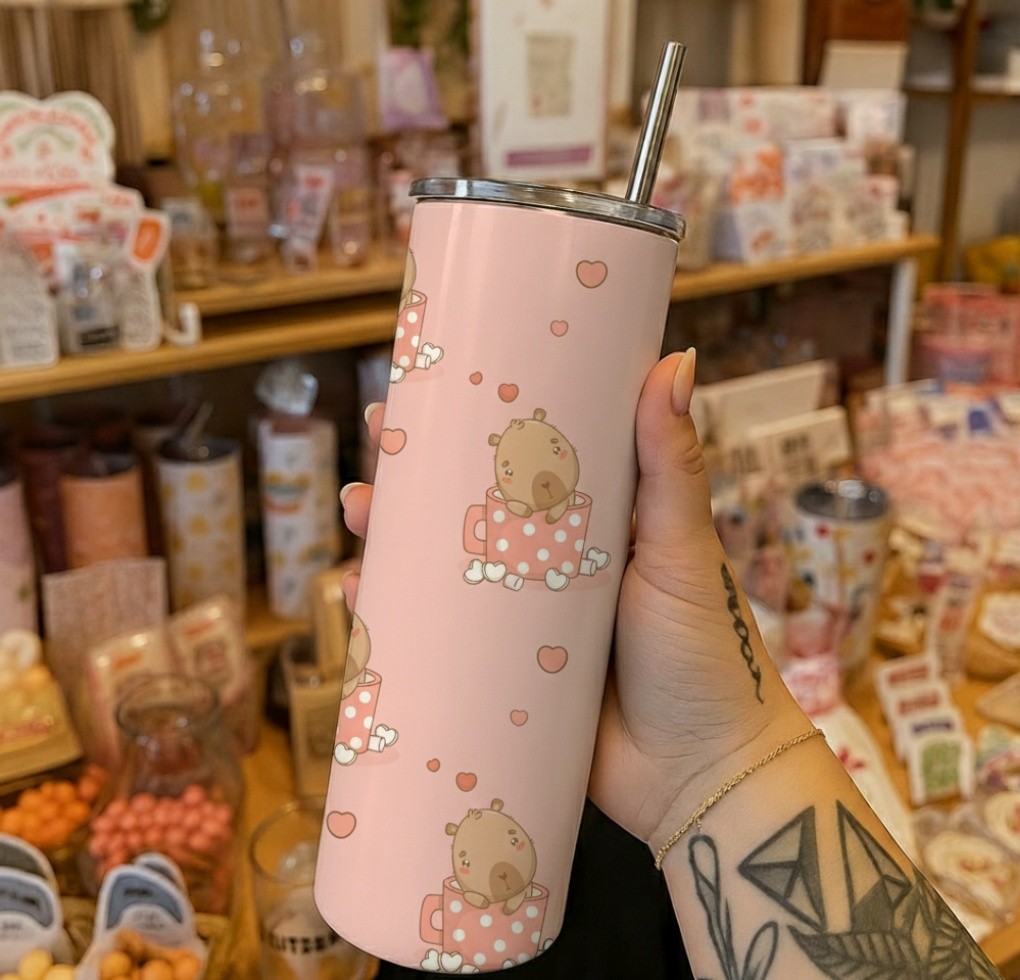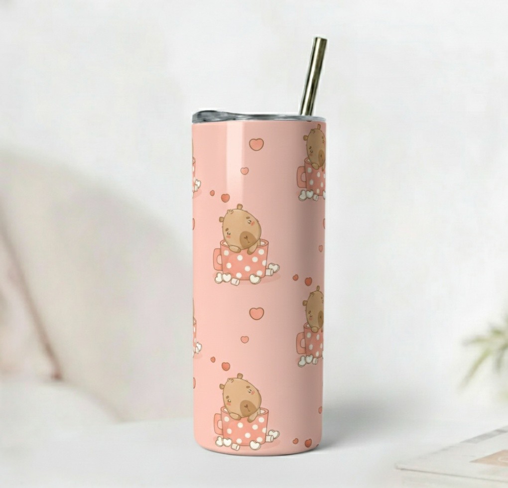 Add a touch of sweetness to your daily routine with the Kawaii Tea Time Tumbler, designed for lovers of cute, cozy, pastel aesthetics. This adorable tumbler features a soft light-pink background decorated with a repeating pattern of a tiny brown teddy-bear–style character sitting inside a pink polka-dot teacup. Small pastel hearts float between the cups, creating a dreamy, comforting vibe.