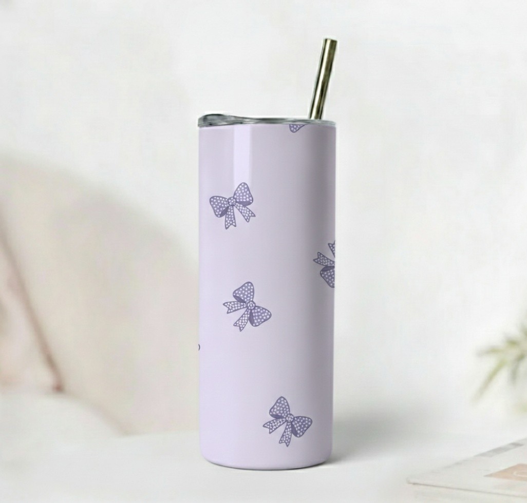 A soft lavender tumbler with a delicate purple bow pattern. Insulated, lightweight, and perfect for coquette and pastel aesthetic lovers.