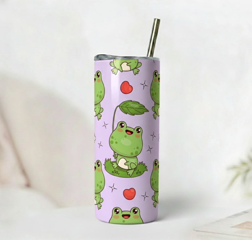 A whimsical 20 oz lavender tumbler featuring cute frogs with leaf umbrellas, hearts, and sparkles. Insulated, lightweight, and perfect for kawaii and cottagecore lovers.